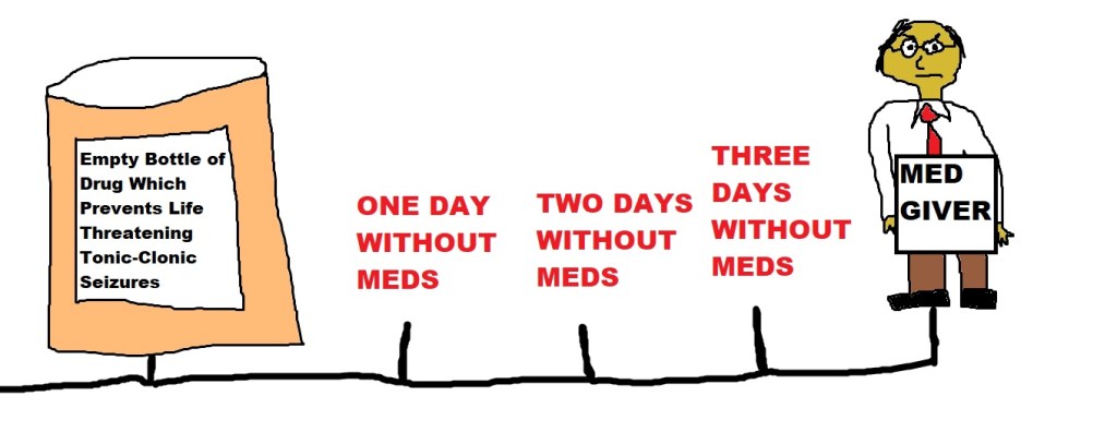 Now various neurologists over the years have solemnly told me that, since I need my medication to live, it is illegal to not help me acquire it if I’m in need.