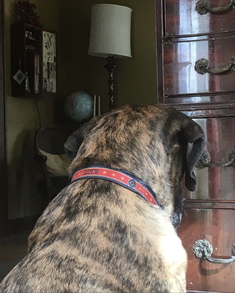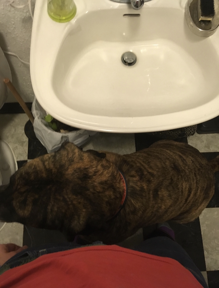 Yet, when we returned to retrieve our dog, my friend directed me to their bathroom because their bathroom is where Hemi had apparently stayed the entire time we were gone. Having a mastiff reside in your bathroom can create a strong deviation from the household norm. In fact, since their small, big-headed pit bull Alice apparently never left the side of our dog the whole time the both of them were in their bathroom for an entire week.