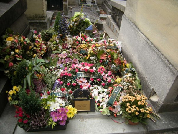 Patti Smith shares how she visited Père Lachaise and the grave of her kin peer, Jim Morrison. I’m too lazy to get up and find my copy of the book to provide the exact quote but, while she was standing at Morrison’s memorial site, a Parisian woman who saw the state of his grave (covered with flowers and random shit) felt it was terrible and said something like, “You Americans have a strange way of showing your people you care.”