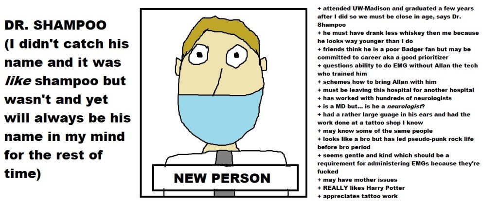 Yet, I’m also aware that paying attention to people’s details and then writing them down could be seen as a very odd and even threatening practice. At the same time, it seems a waste to get an idea about people and then just walk away. I will never know if Dr. Shampoo strategized a way to get Allan the EMG tech to come with him to his next hospital.