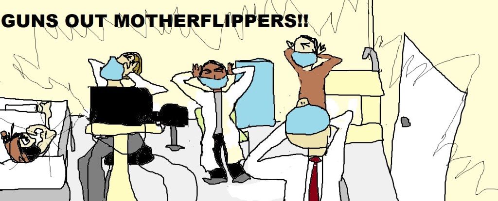 Which is why I don’t feel a lot of people could do an EMG test. Because if you’re not “good with” needles, or have an issue with claustrophobia or with being electrocuted, or being essentially naked on a bed in the company of a group of men who are filling the entire space of the tiny room with their bodies…