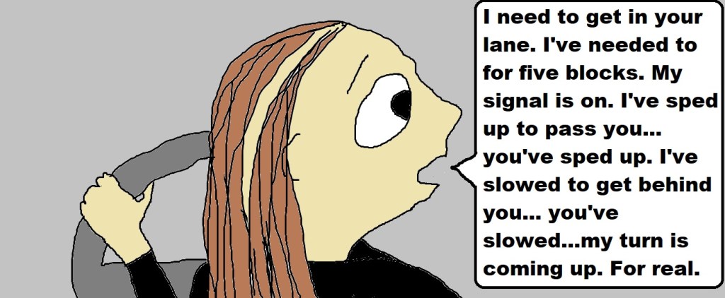 And, as soon as the liquor stores and Dollar Stores and cash-checking places turned into breweries and fancy grocery stores and cookware shops, I experienced a driver who simply would not allow me to merge into the right lane.