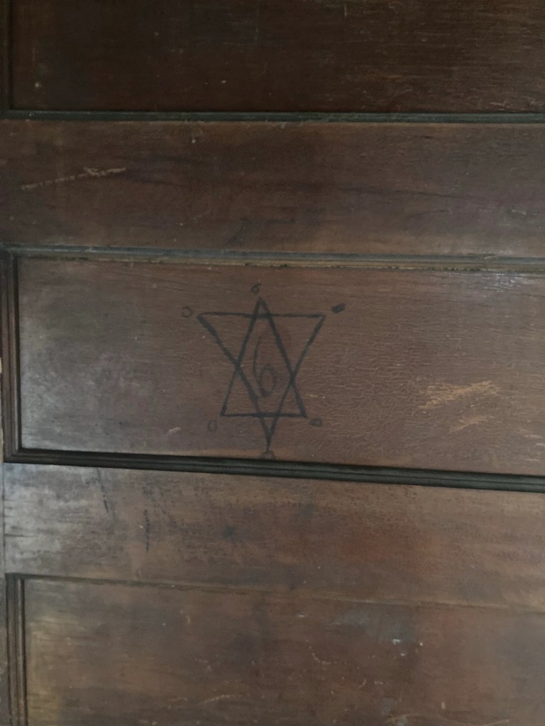 I recently noticed an undiscovered symbol scrawled on a basement door. It’s weird I never noticed it before but that’s because that door is usually opened and held in place by a board but the other day the door was closed with its face facing me as I walked down the basement stairs which is when I saw the pentagram