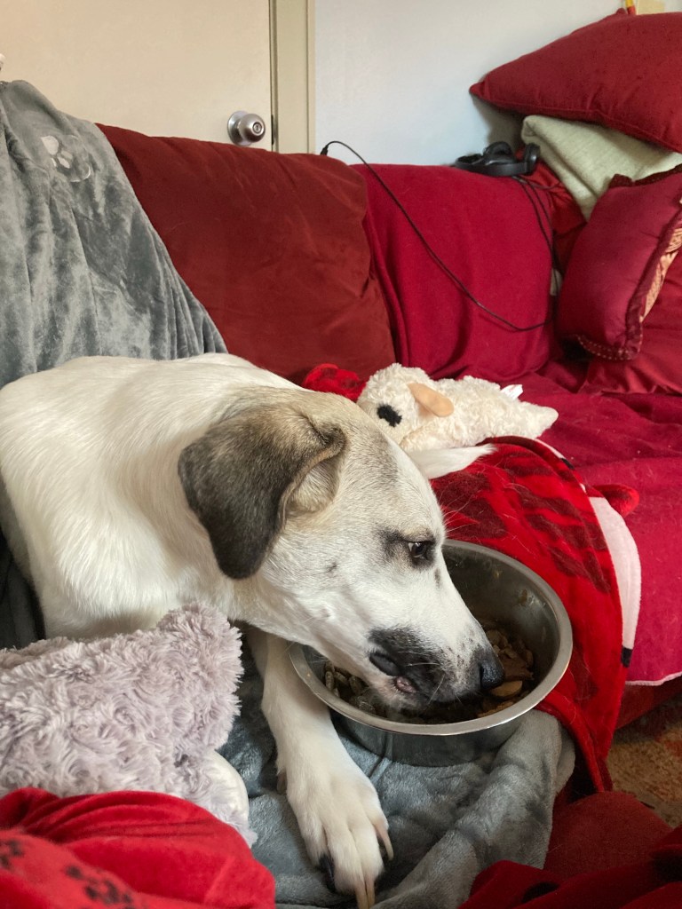 We quickly learned that she wouldn’t move to eat or drink. We had to physically bring her her food and water bowls to her on the couch.
