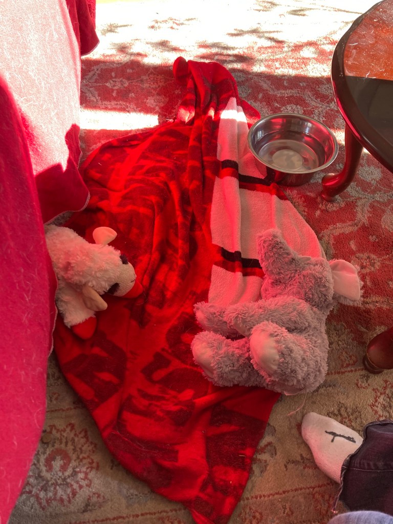 But she did “sit”. And she continued to stay as I set up her spot on the couch.