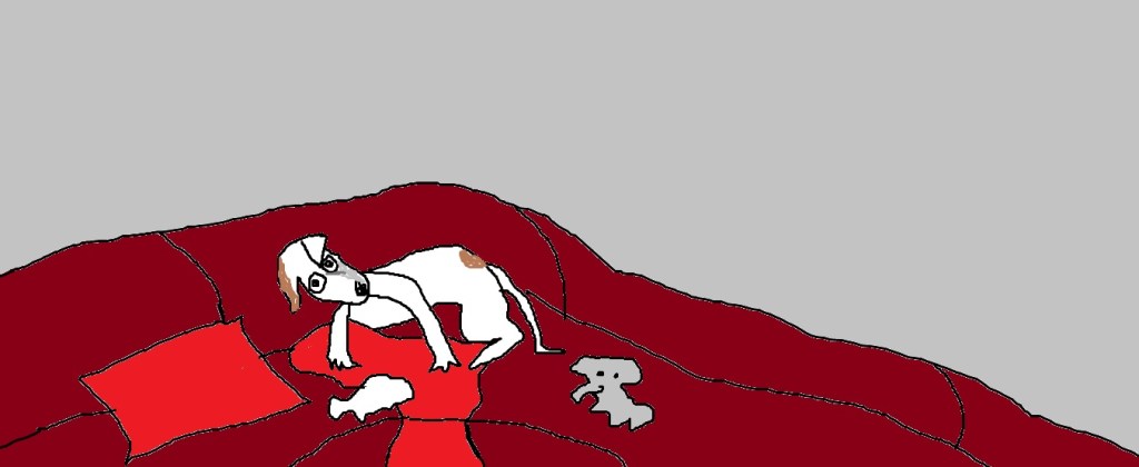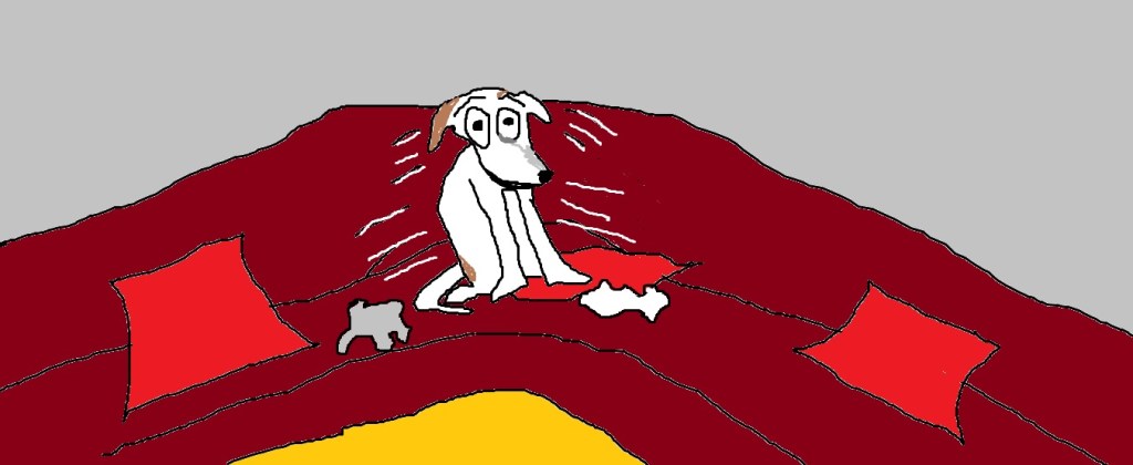 So I gently lifted her up and set her on the floor, telling her “no” and “stay” and, sure, the dog is not trained but she knows the words and, instead of heeding, she practically crawled over me to get back on the couch.