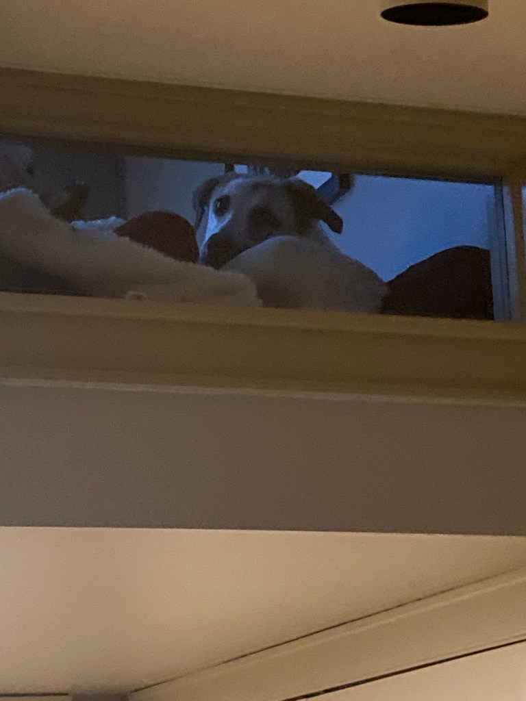 1) noticing I was home and giving a shit about it by lifting her head to look at me through her view window