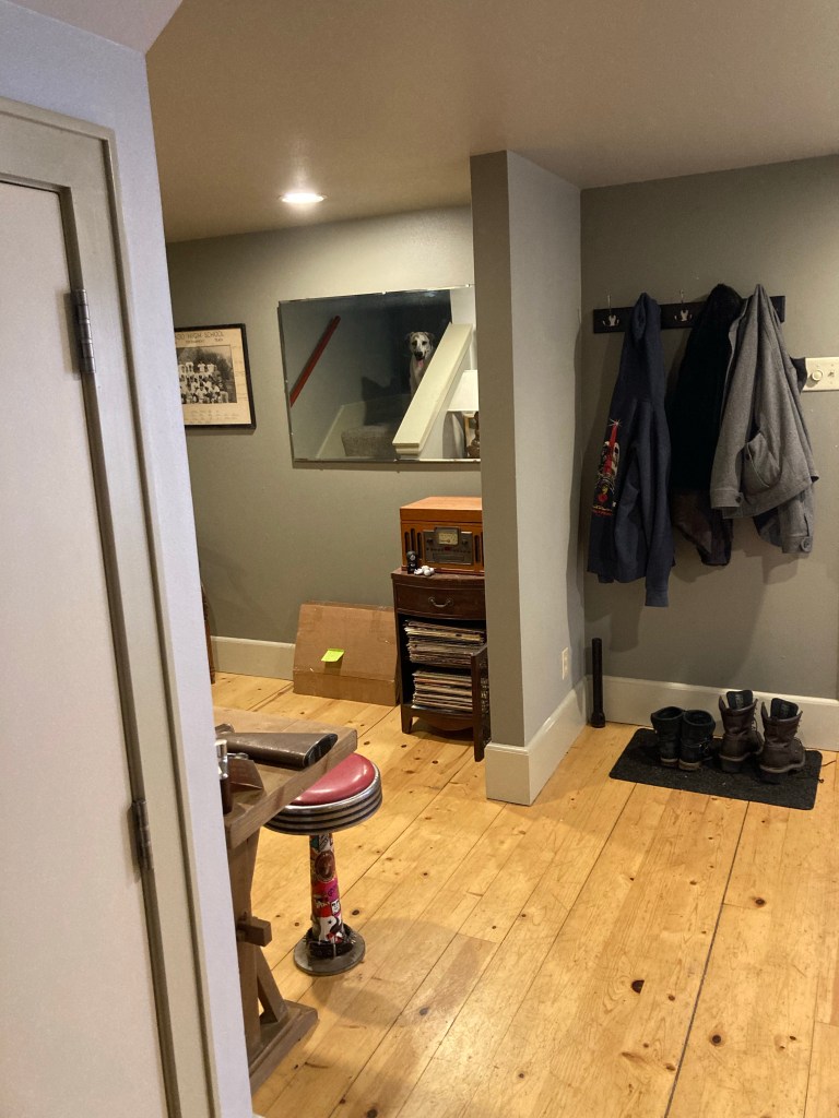 But today, while I was in the bathroom getting ready for my interview, I heard June leave the kitchen, go upstairs, but then come back down the stairs to do a full loop around our breakfast bar and then go back up the stairs to come back down the stairs…