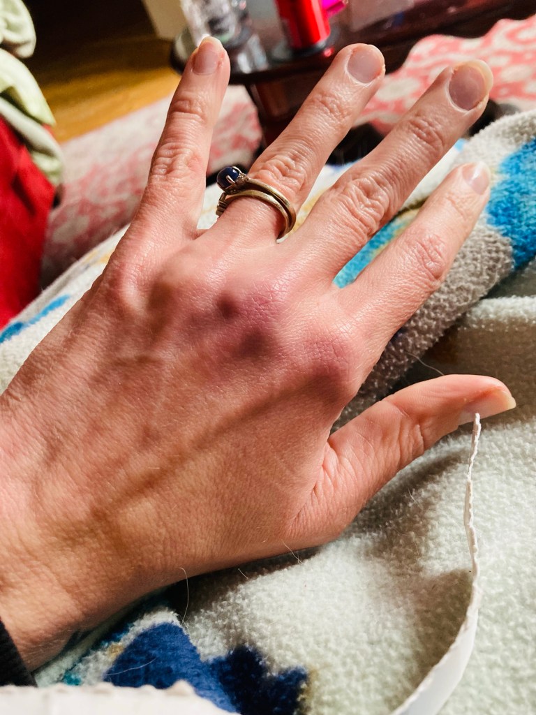 FOUR: Meanwhile, looking down at my swollen hand, I just realized that yesterday I fell hard for the first time in a long time and I don’t quite know what happened and… holy cats, maybe that was a sign of my ALS starting up. The super neurologist told me to tell him know if I started falling down.