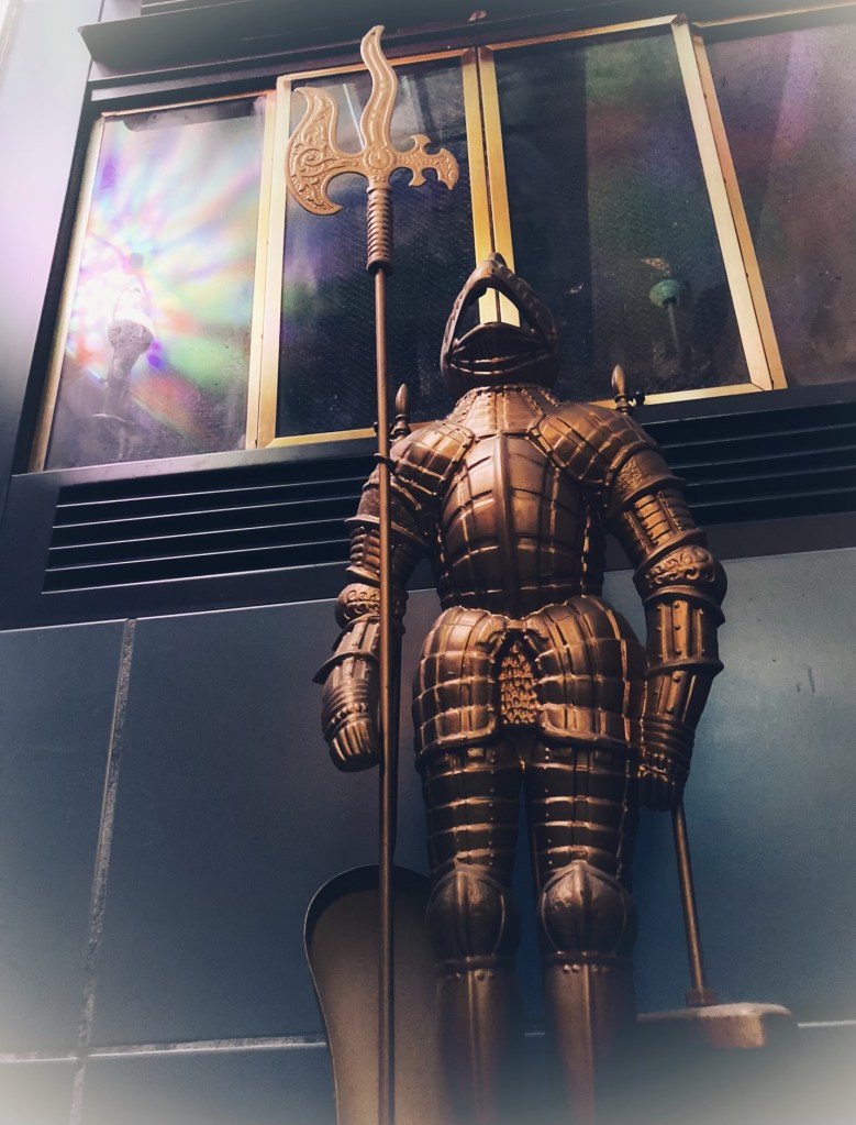 A metallic knight who is guarding a fireplace poker and brush and whatever else a fireplace needs to maintain itself: